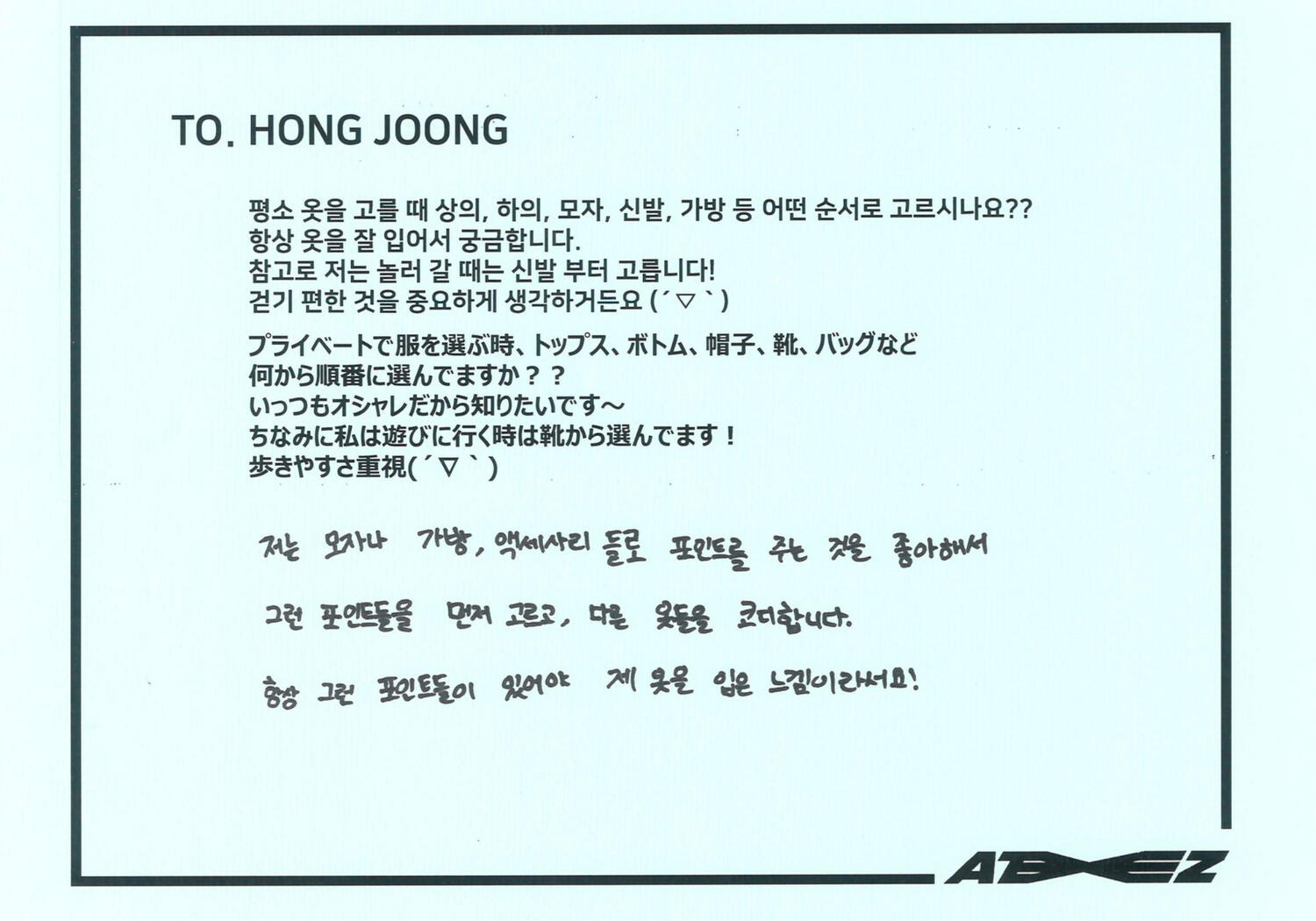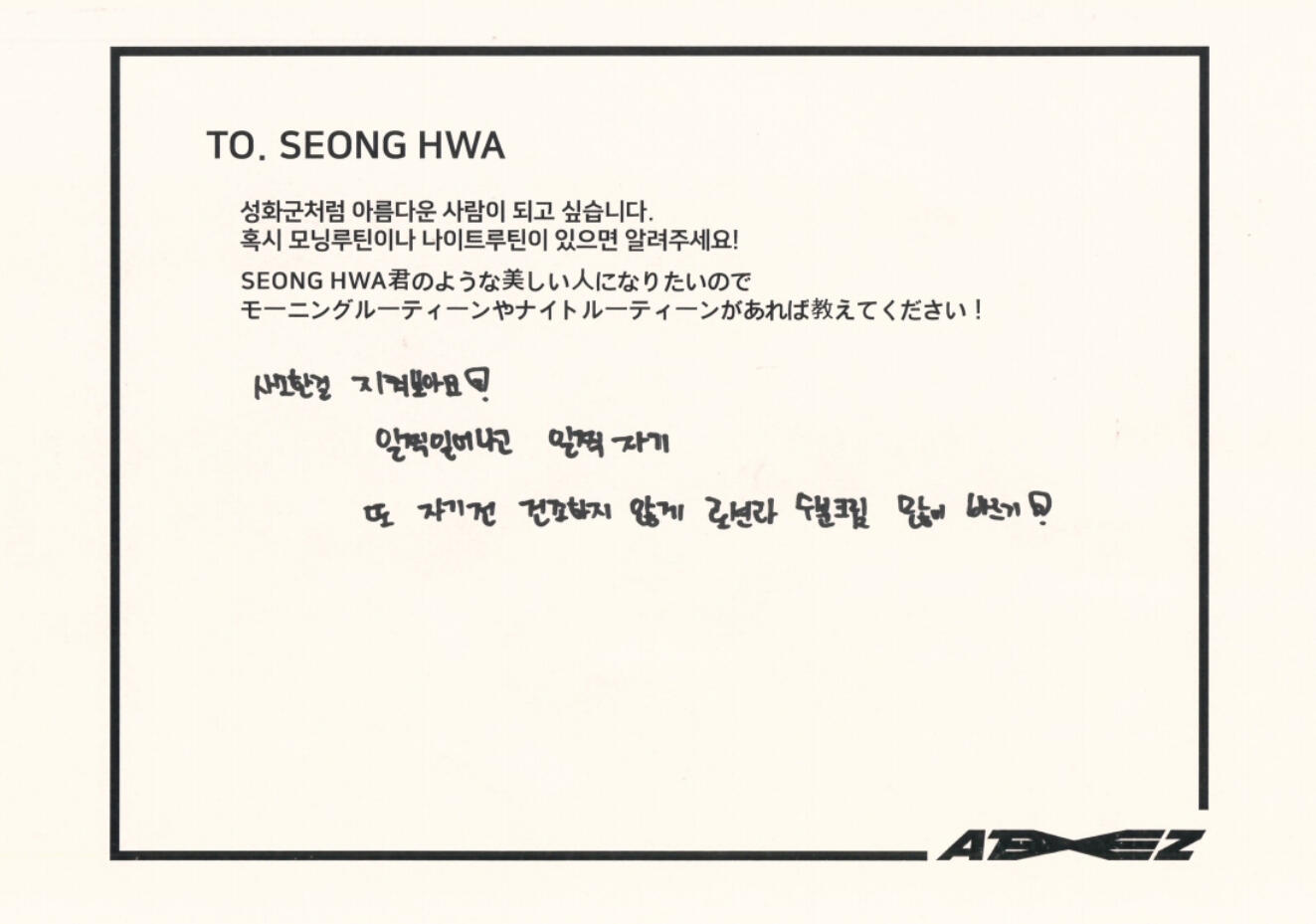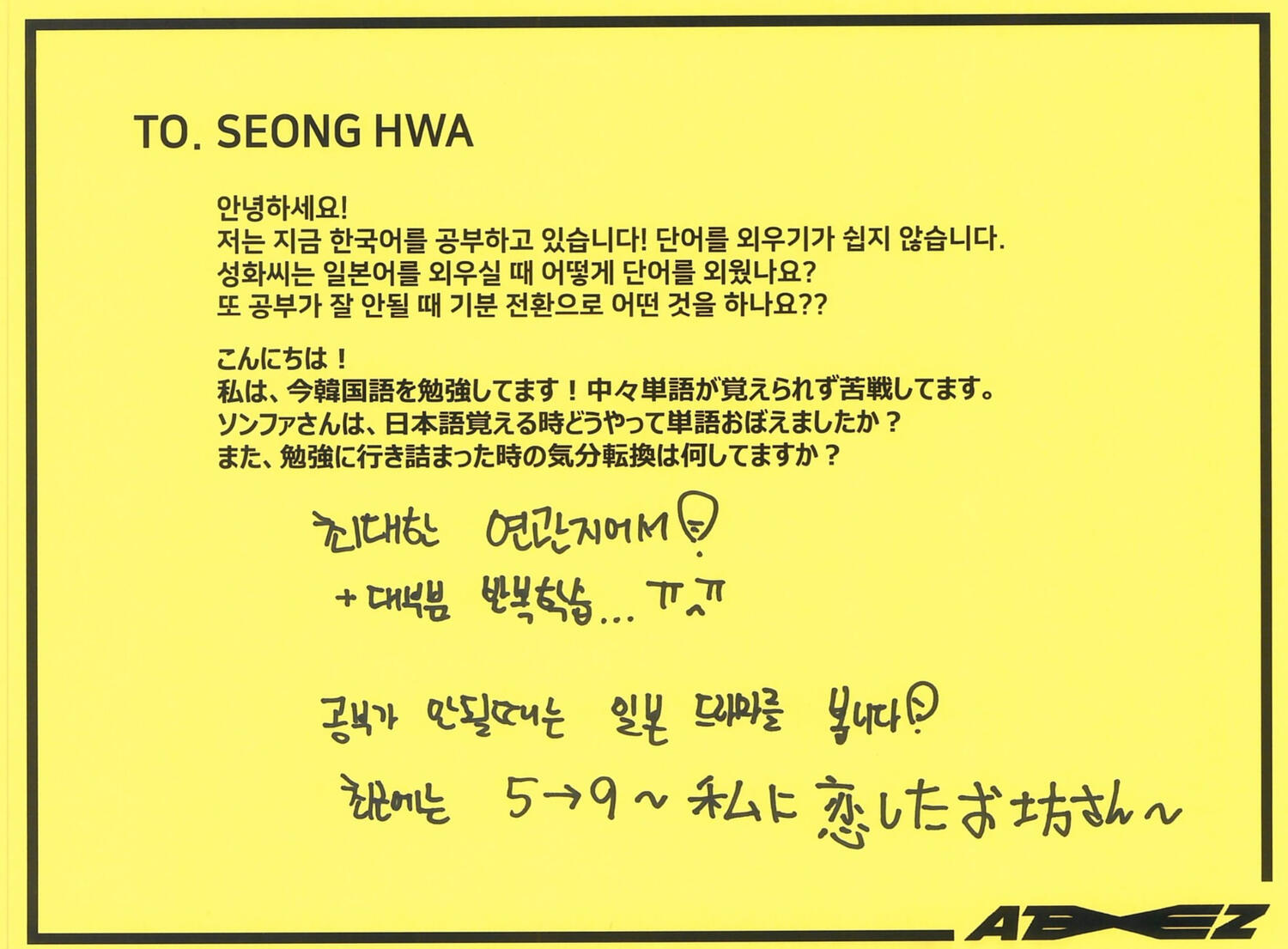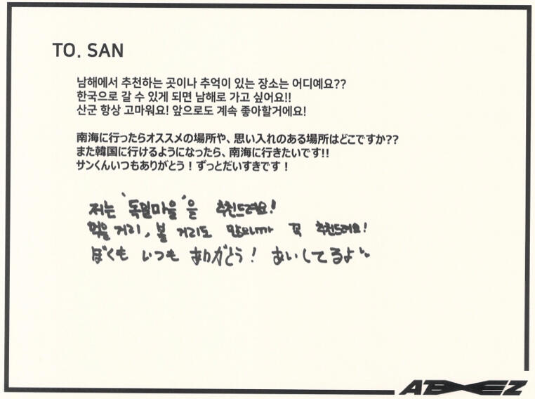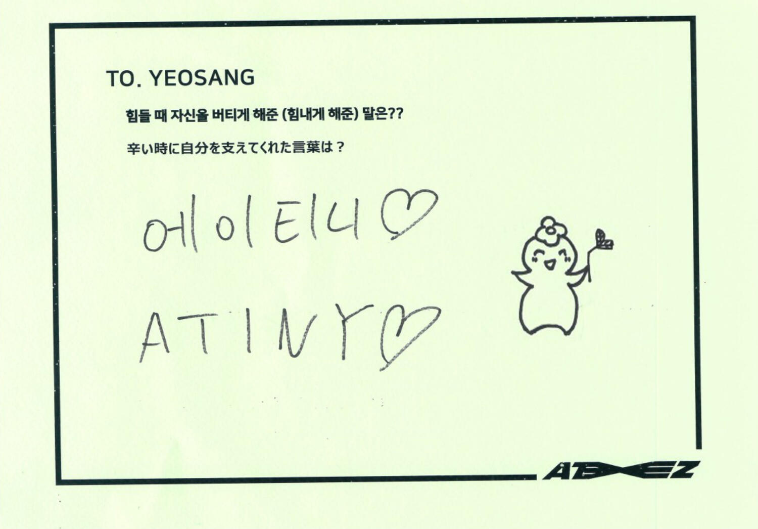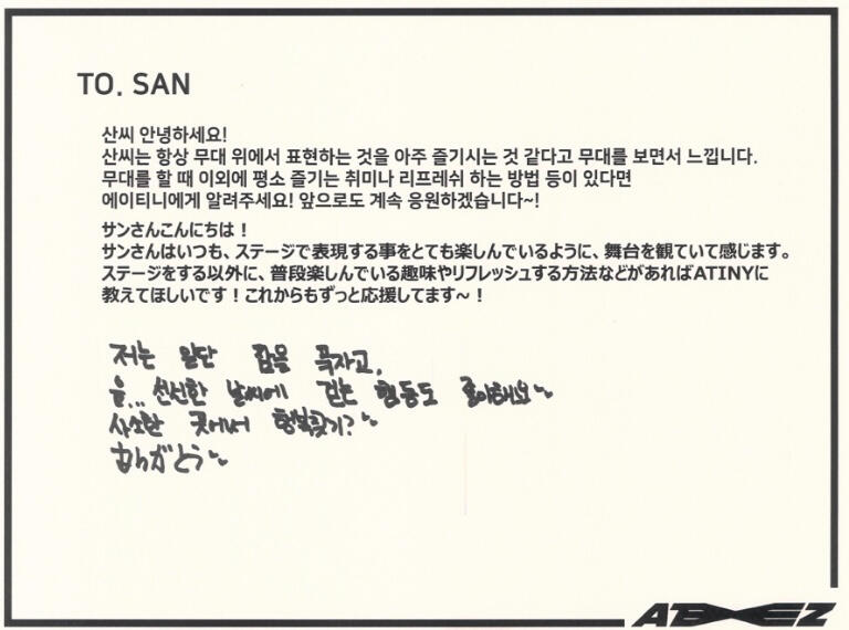 Actually, I like candy much more than chocolate. My favorite candy is Korean candy. I like Sunkist fruit candy and green grape candy the most!! Please definitely try it once ATINY!! I love fruit candies very much ♡ I can't directly give ATINY candy, but I feel like writing a letter directly like this will transmit it ♡ Did you enjoy the Seoul concert? So many people came!