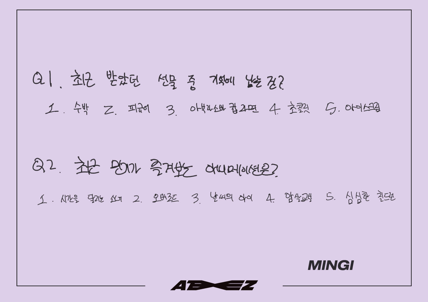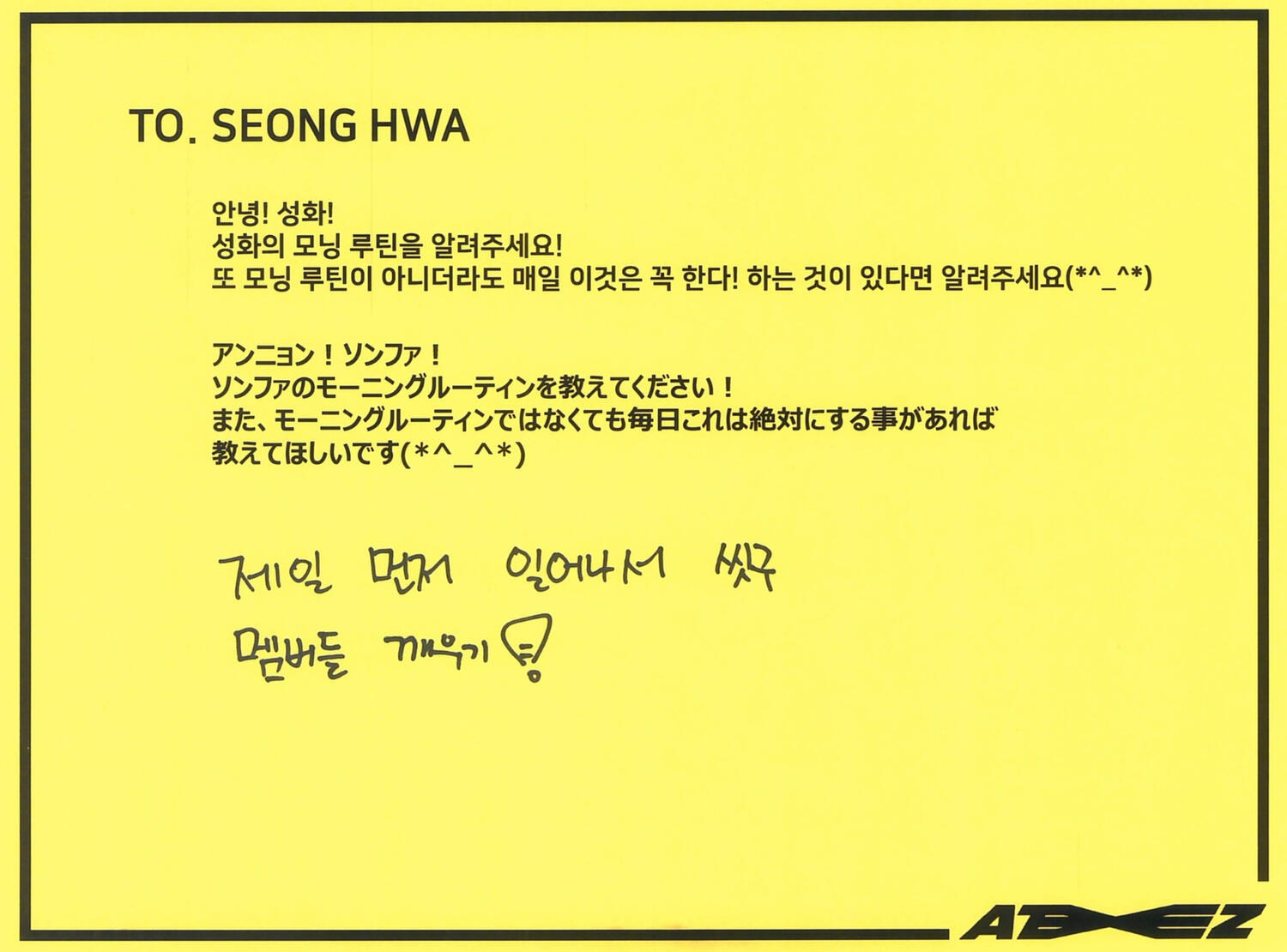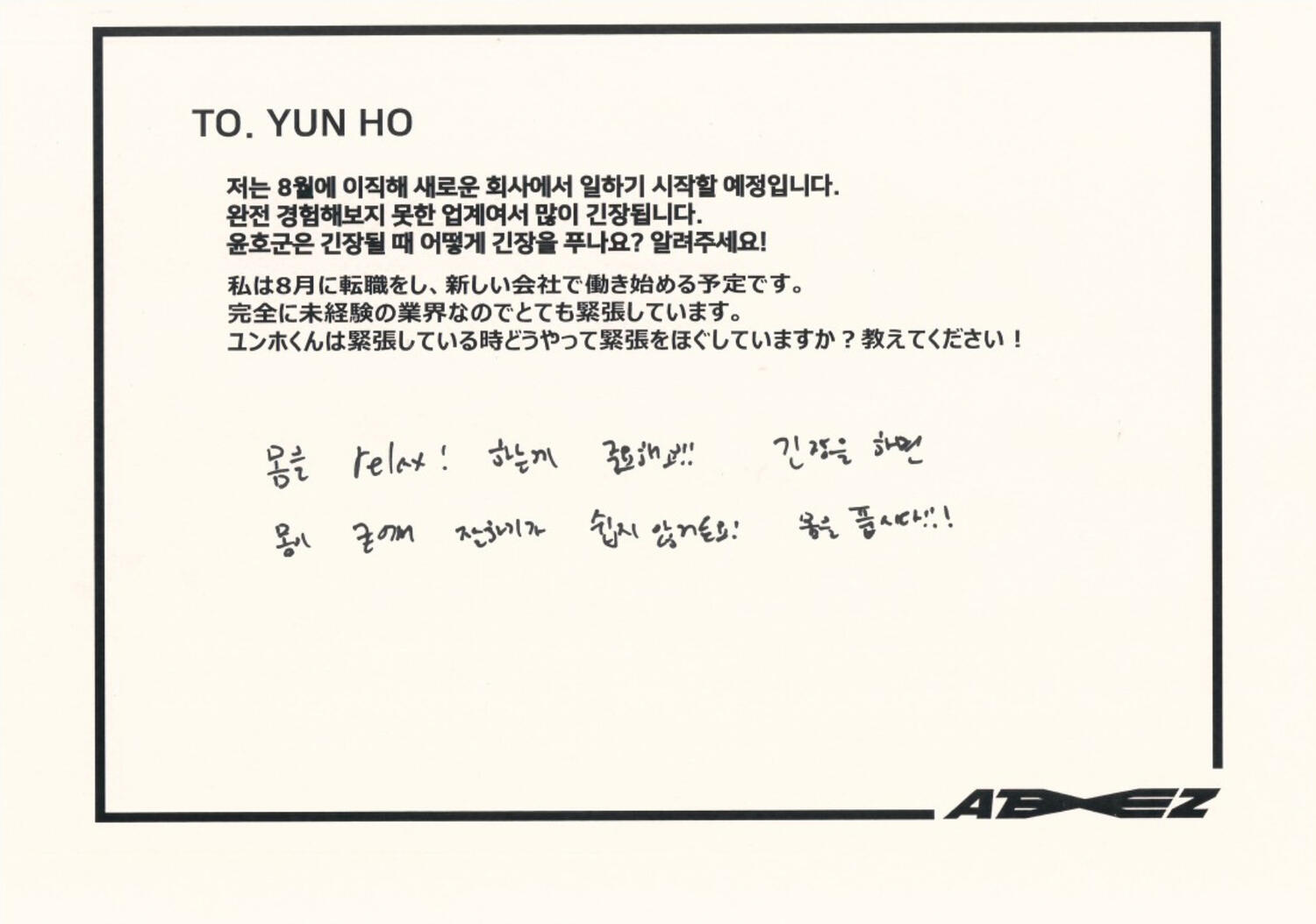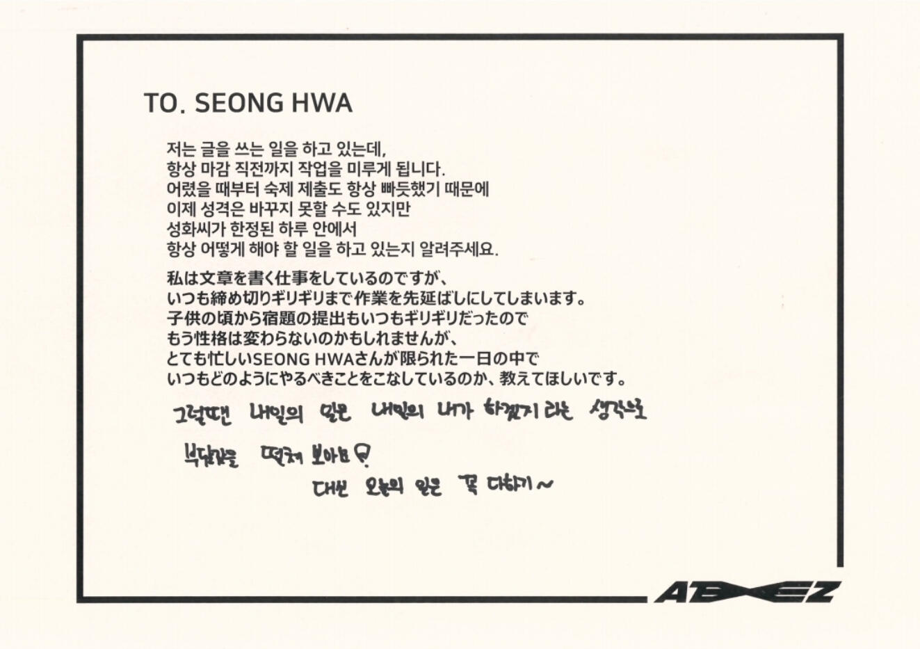 Actually, I like candy much more than chocolate. My favorite candy is Korean candy. I like Sunkist fruit candy and green grape candy the most!! Please definitely try it once ATINY!! I love fruit candies very much ♡ I can't directly give ATINY candy, but I feel like writing a letter directly like this will transmit it ♡ Did you enjoy the Seoul concert? So many people came!