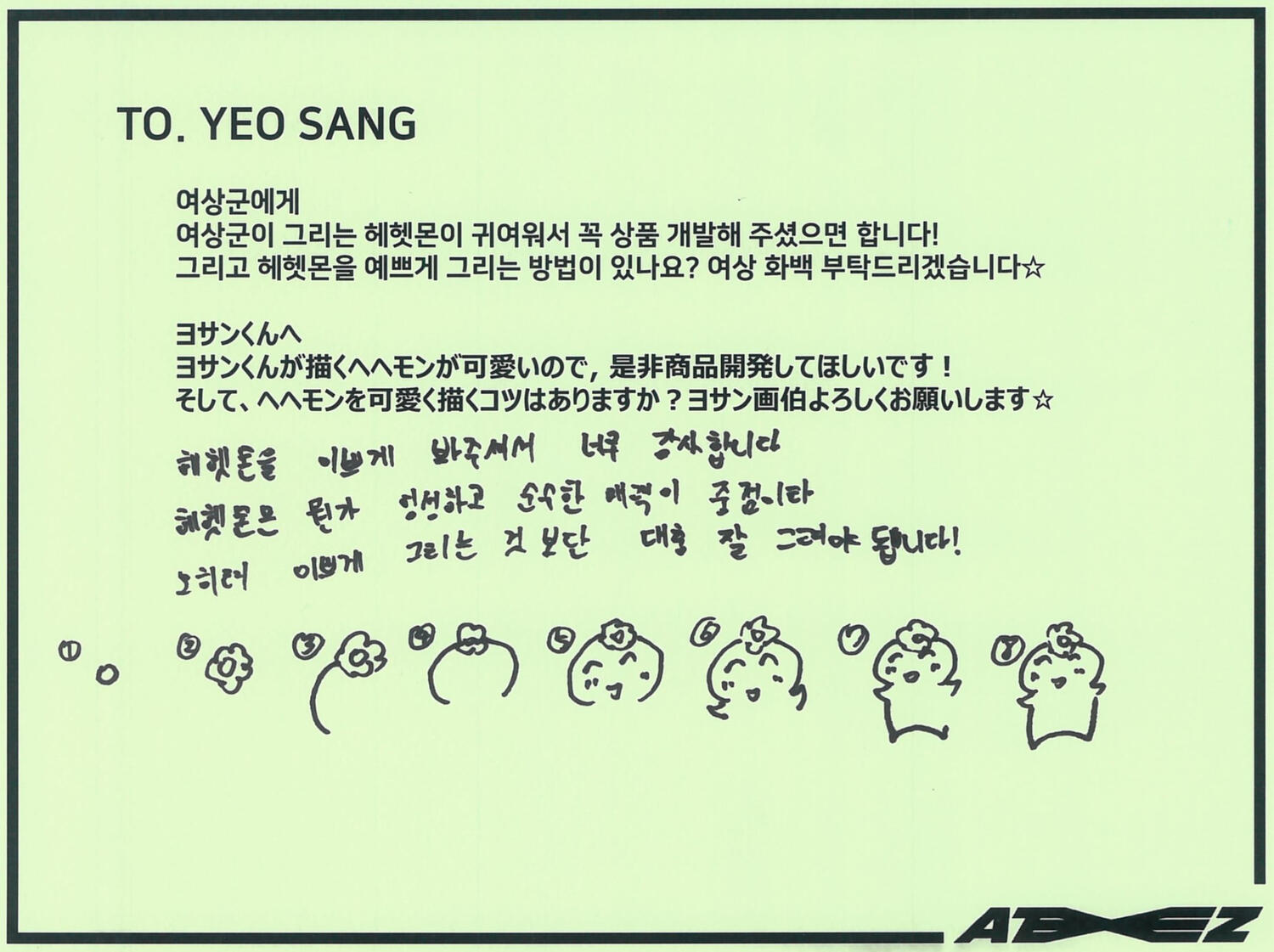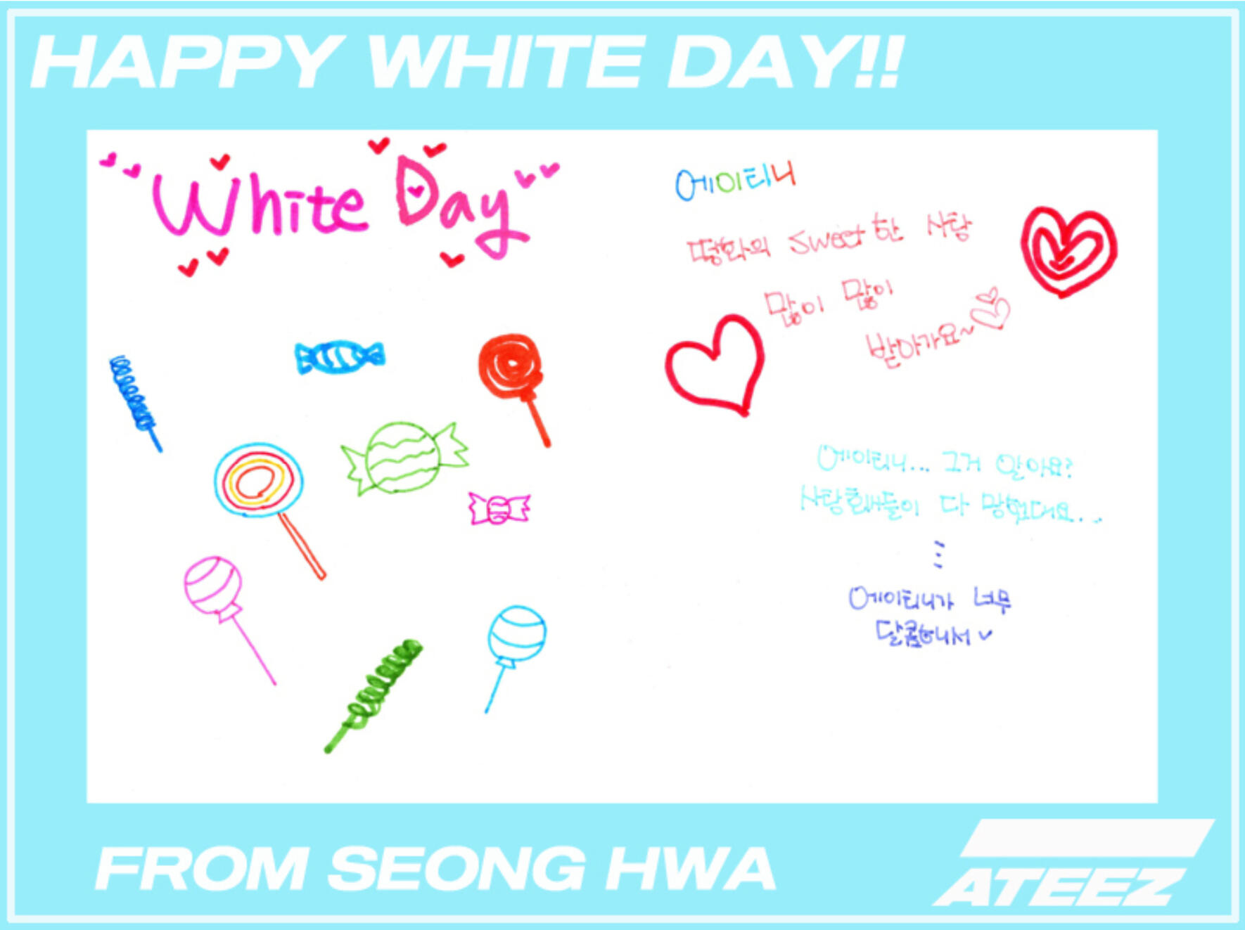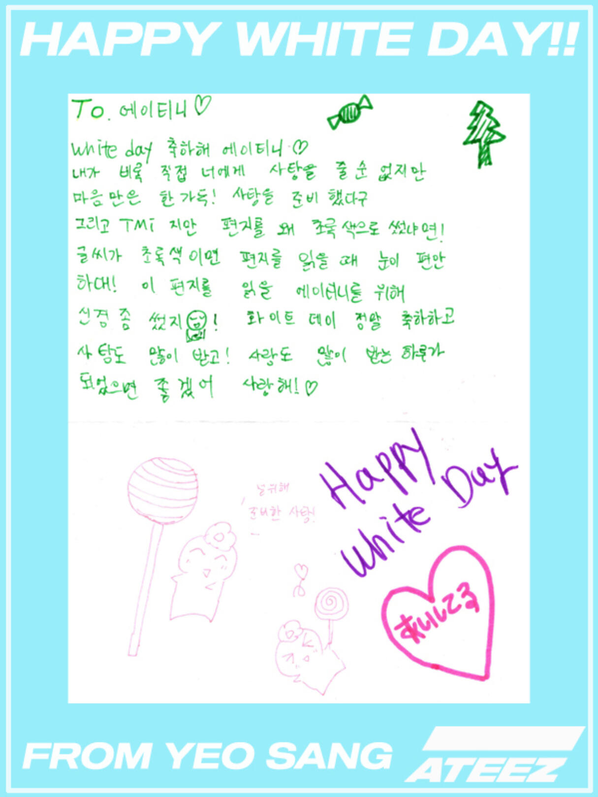 Even though I can't give you candy myself, my heart is full! I prepared some candy and TMI, why did I write the letter in green! If the letters are green, it will be easier for you to read! Maybe I wrote it for ATINY who is going to read this letter! Congratulations on White Day and I hope you get lots of candies! I hope you get a lot of love. I love you! ♡