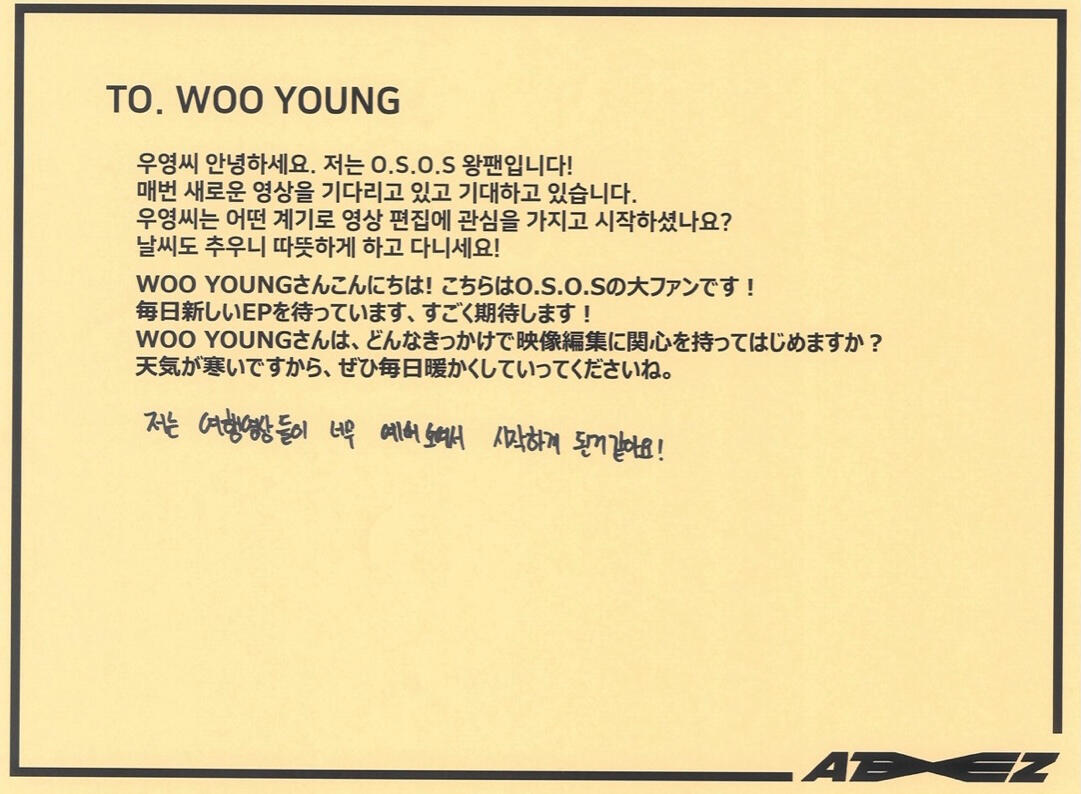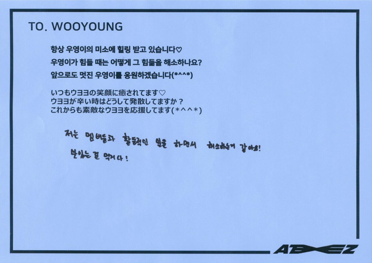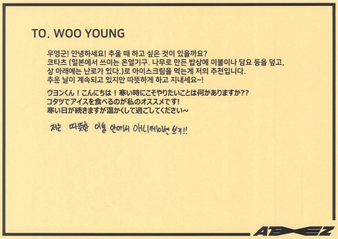 From. ATEEZ WooyoungWe will protect you anytime, anywhere, and don't worry about us because we're close to each other! Thank you always, I love you♡