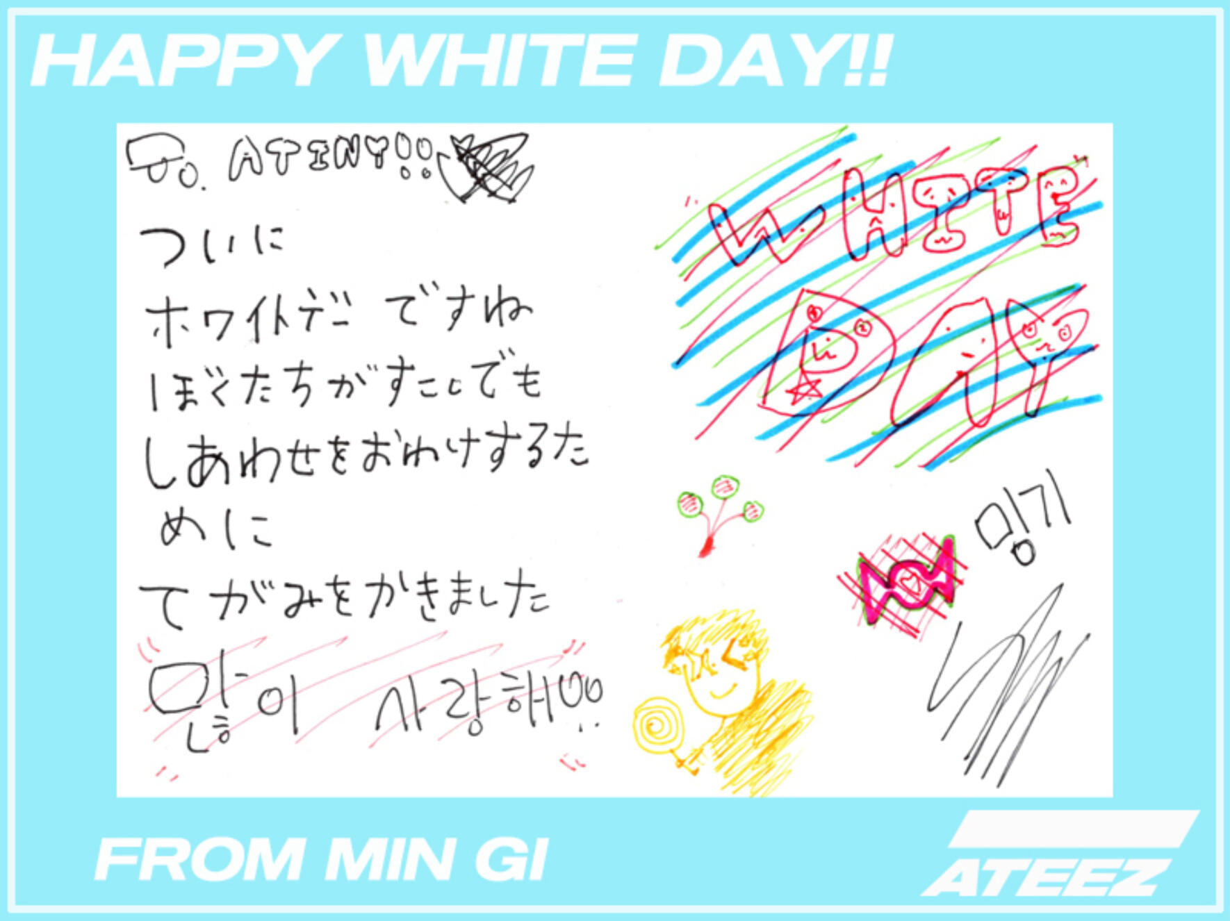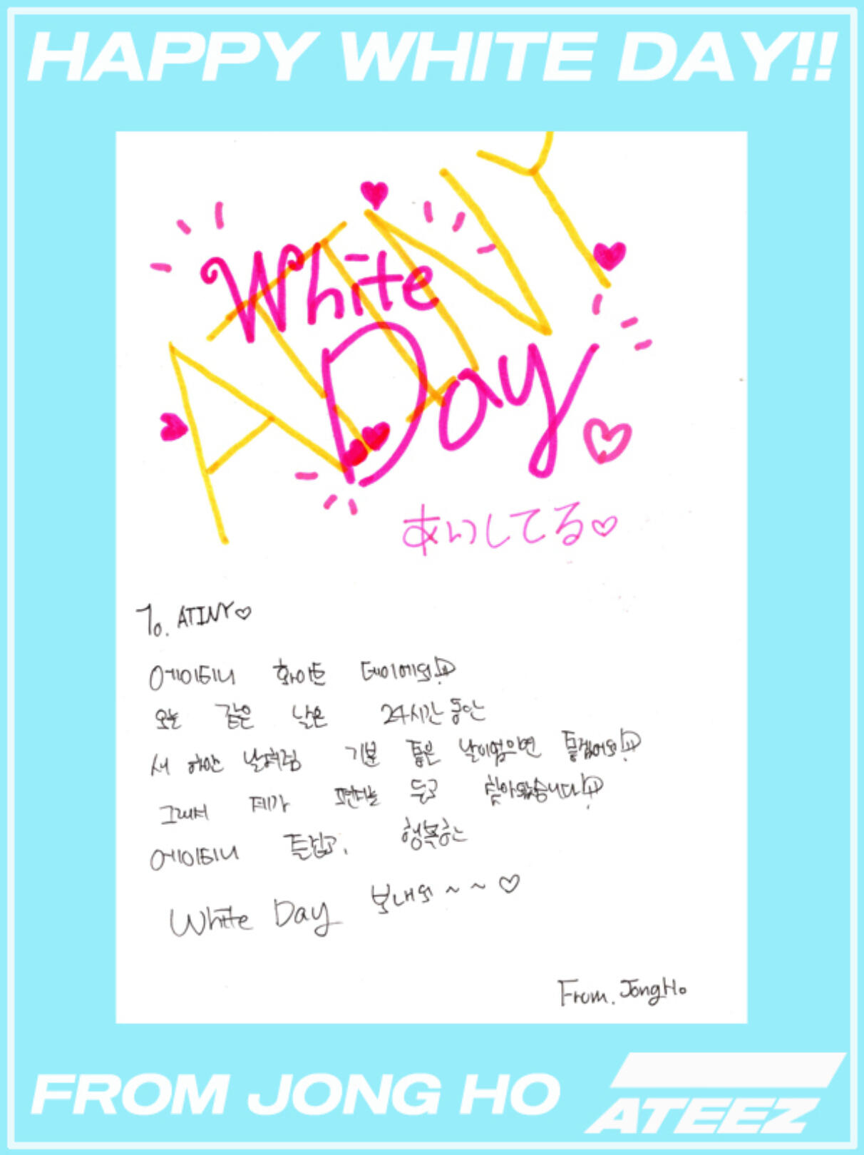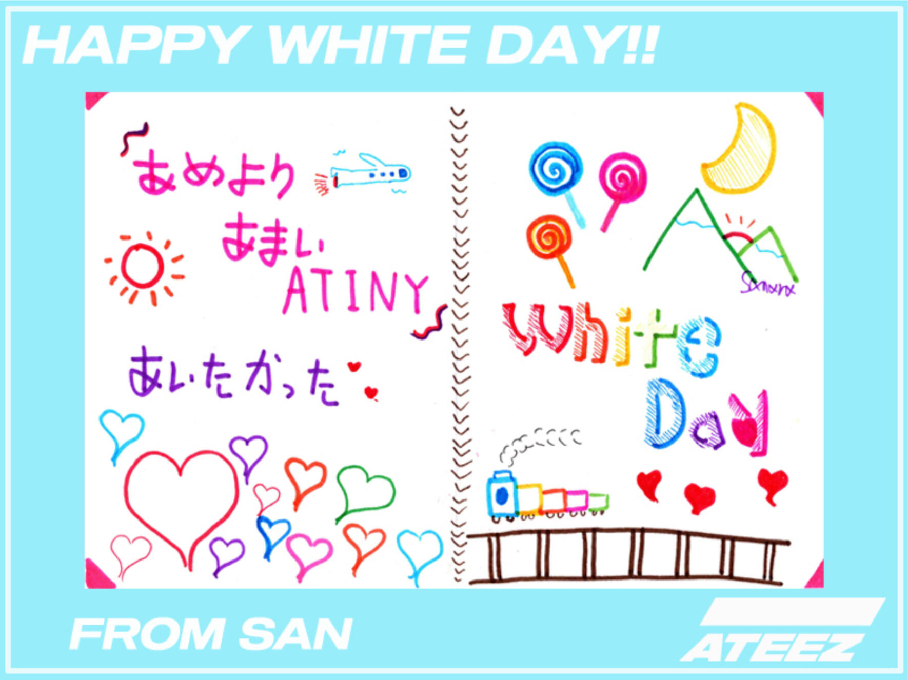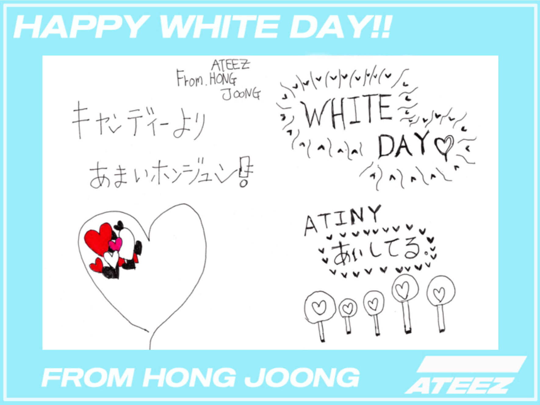Hello ATINY!! I prepared a commemorative heart card for White Day this time!! You've always given me sweet days, so this time we're giving you presents! (White!!) Our pure and bright ATINY!! I love you a lot and I love you again ♡ Today is out ATINY DAY ~